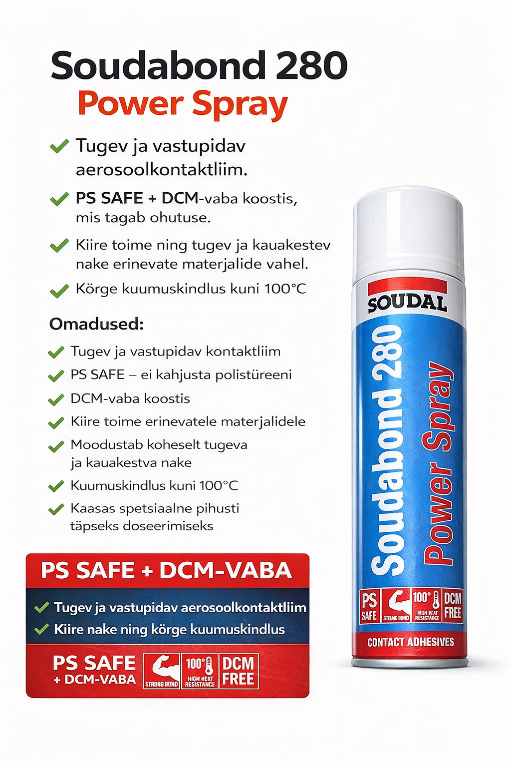Soudabond 280 Power Spray on kvaliteetne ja eriti tugev aerosoolkontaktliim, mis sobib erinevate materjalide kiireks ja vastupidavaks liimimiseks. Tegemist on professionaalse lahendusega nii ehitajale, paigaldajale kui ka kodukasutajale.